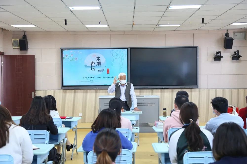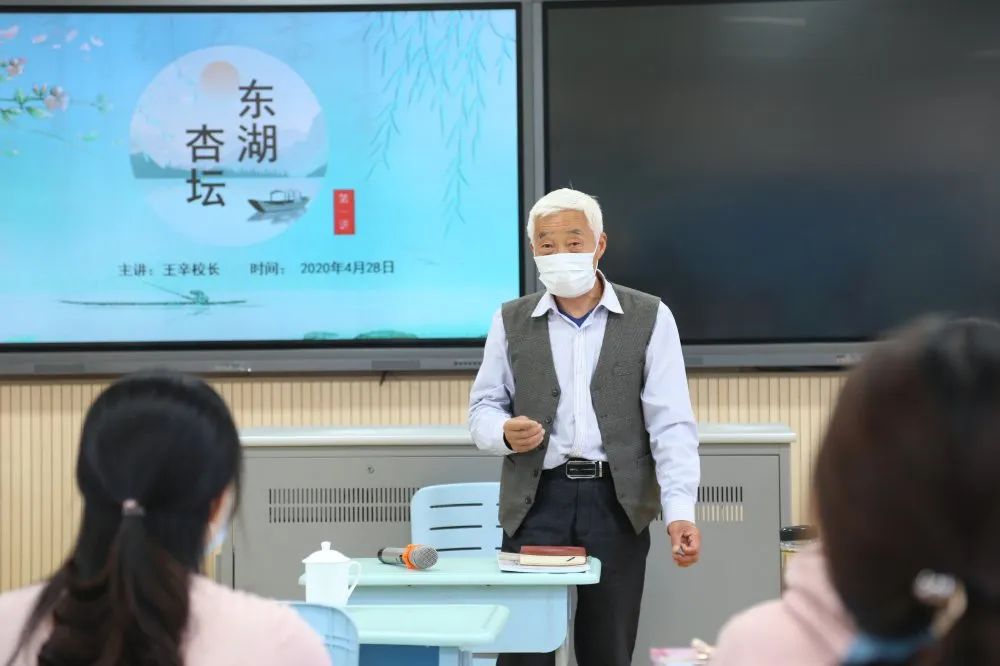 聆听前辈讲述,埋下杏坛之种。东湖杏坛第一讲请到了东湖小学首任校长王辛为全体青年教师进行讲座。王辛校长用一句句生动的语言,一件件鲜活的案例讲述了自己的求学之路、从教经历,用实际行动诠释了一名老师的坚守以及幸福感的获得,希望广大青年教师用一颗感恩的心去热爱学校、热爱学生、求真务实、珍惜岗位,为学校的发展贡献自己的青春和智慧。