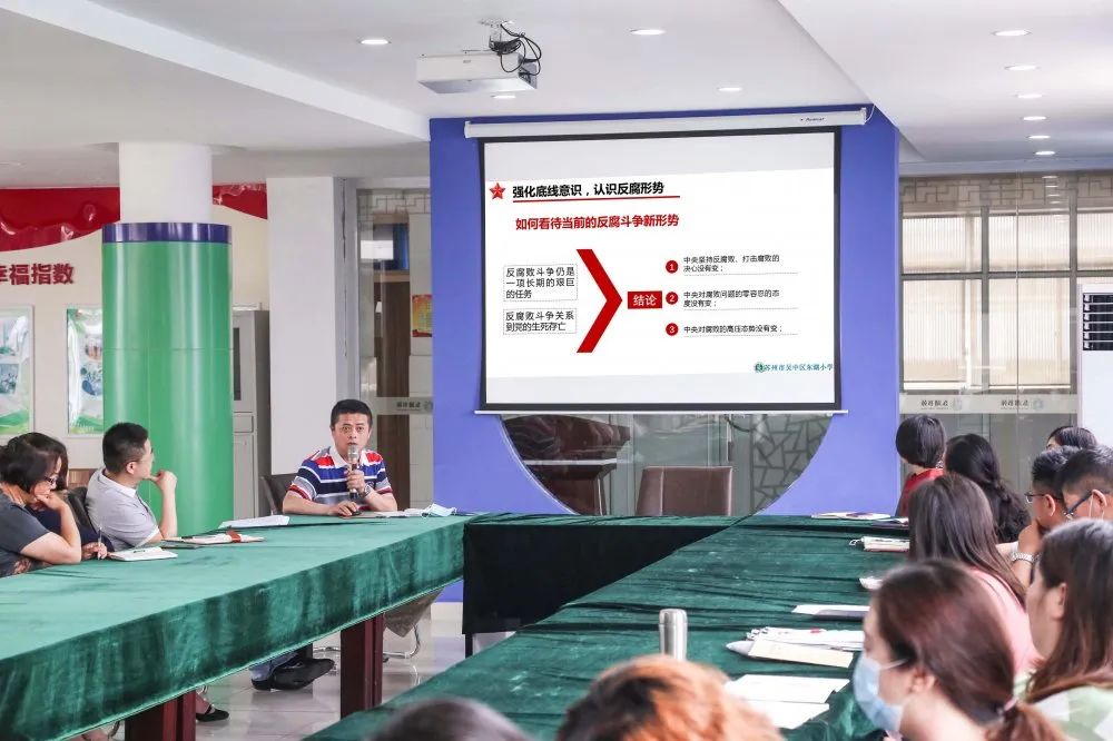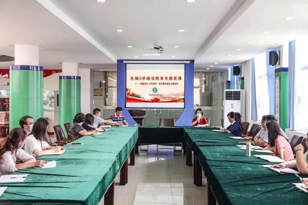 5月21日,东湖小学党支部在党工之家开展了“严守底线 廉洁从教”专题培训,党支部书记蒋欣主持会议,全体党员教师参加会议。